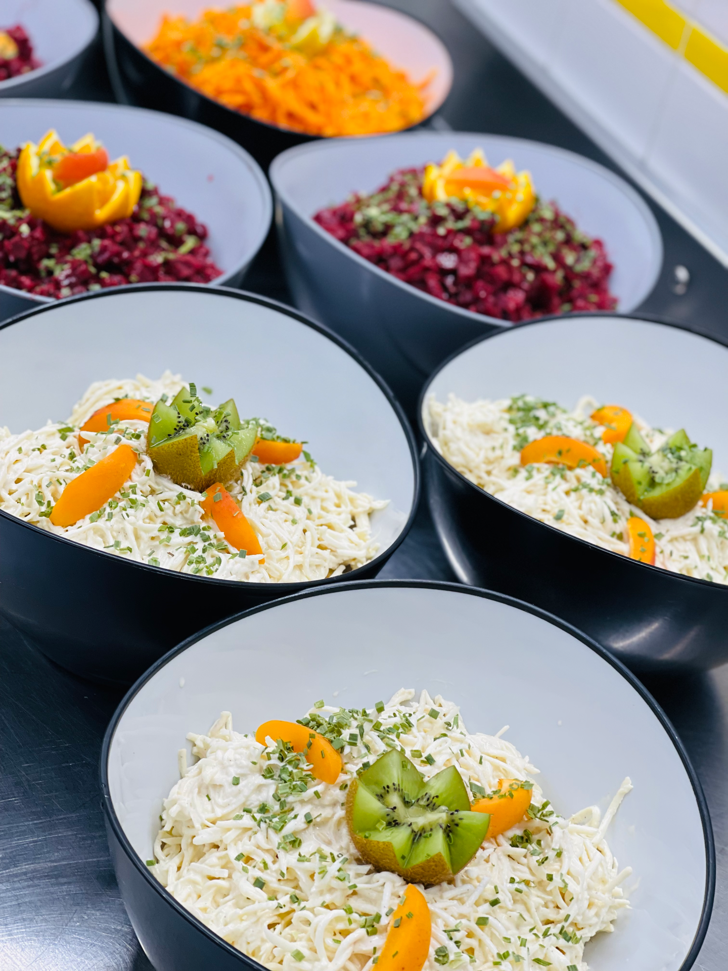 * Les crudités : Salade de carottes, céleris, concombres, pommes de terre, betteraves, tomates, taboulé