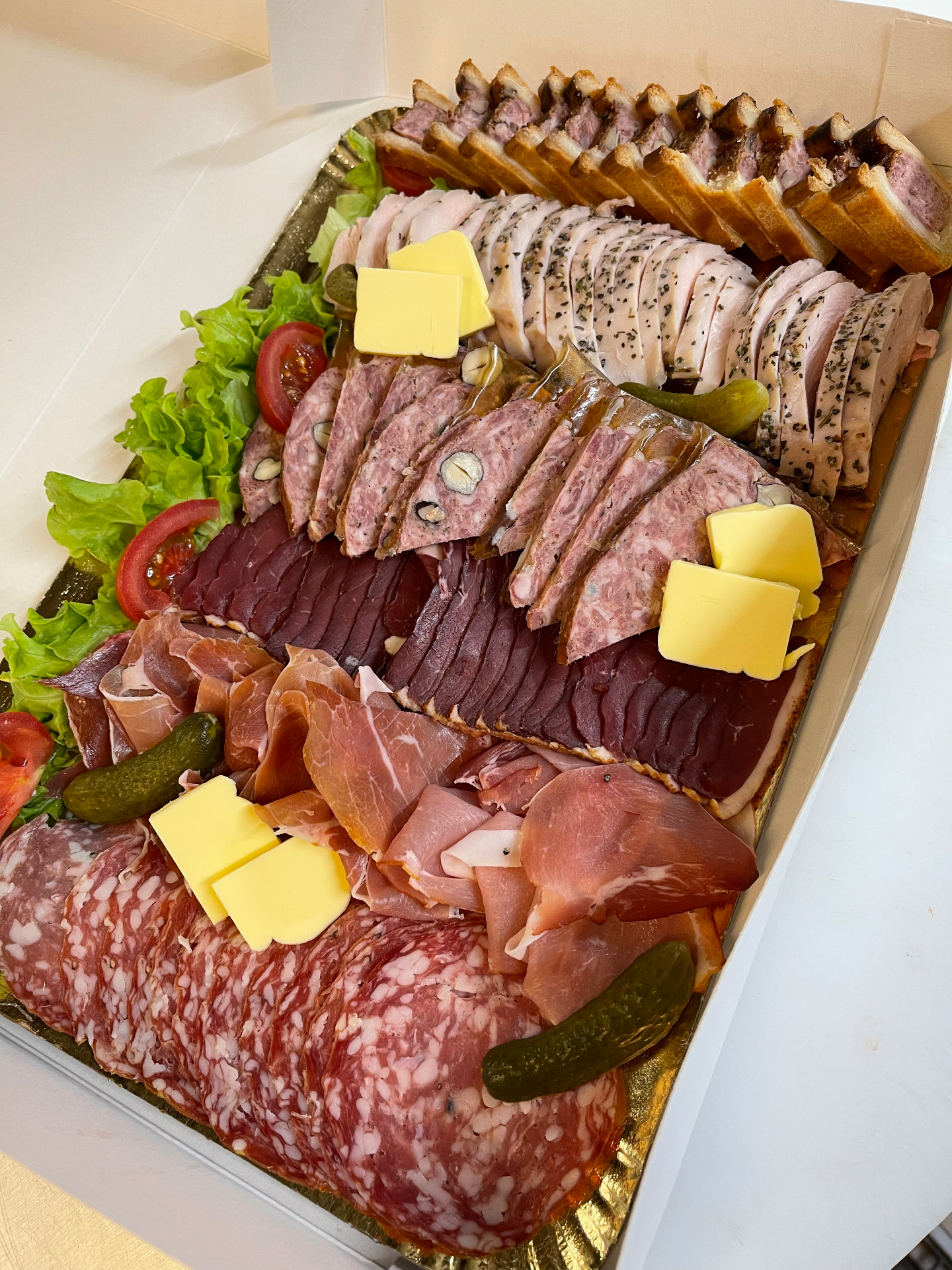 Rosette, jambon fumé, pâté en croûte, collet fumé, pilon de poulet, magret de canard fumé, terrine de poisson, crevette, rollmops